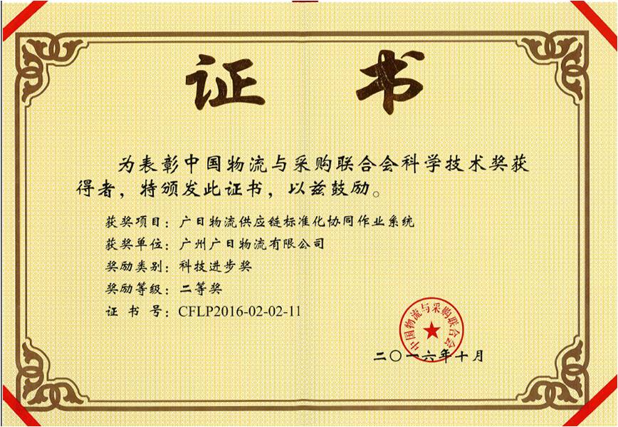2016年10月,廣日物流憑借“廣日物流供應(yīng)鏈標(biāo)準(zhǔn)化協(xié)同作業(yè)系統(tǒng)”項目榮獲由中國物流與采購聯(lián)合會頒發(fā)的“2016年科技進步獎二等獎”。中國物流與采購聯(lián)合會的科學(xué)技術(shù)獎由國家科學(xué)技術(shù)獎勵辦公室批準(zhǔn)設(shè)立,旨在獎勵全國物流與采購以及生產(chǎn)資料流通領(lǐng)域中的技術(shù)發(fā)明與科學(xué)技術(shù)進步成果。
